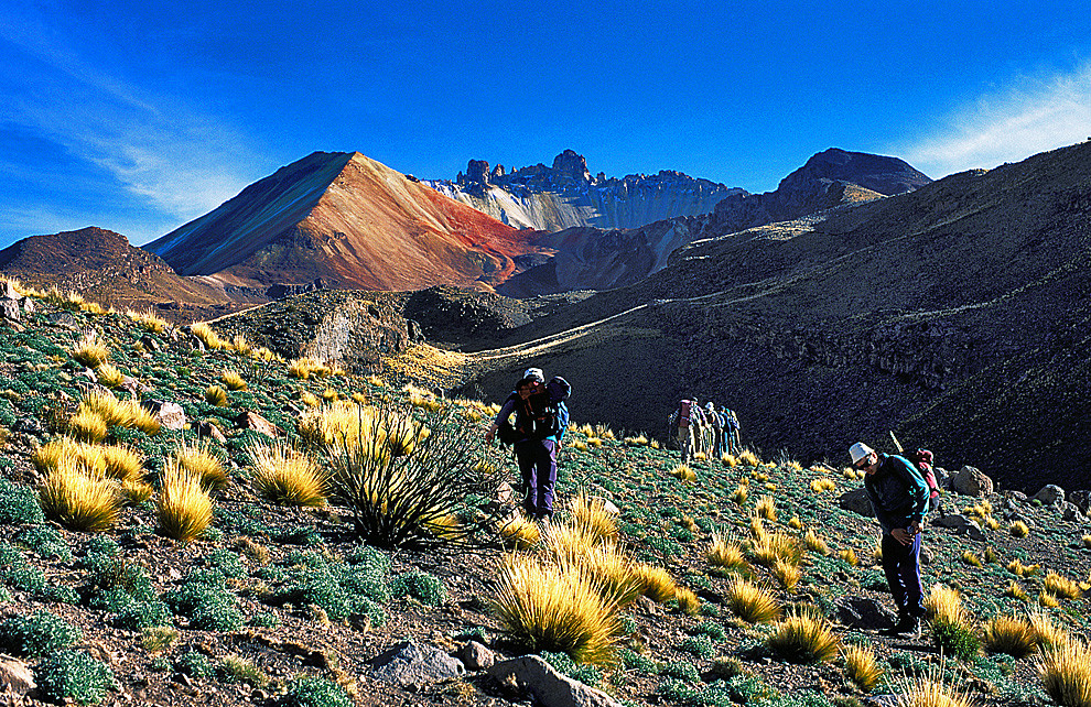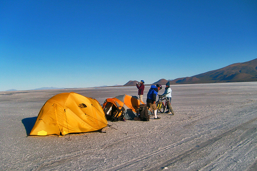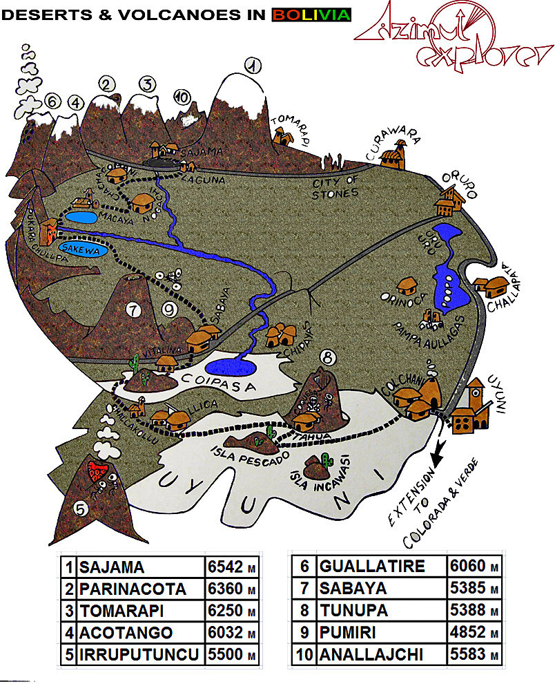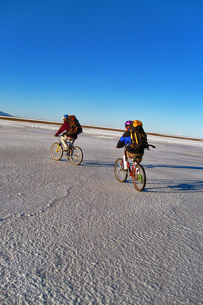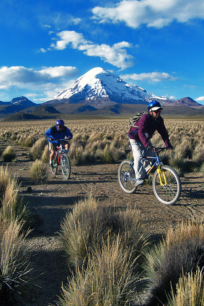 Remains of disappeared oceans, the red deserts of Sajama, Uyuni and Lipez and the salt flats of Coipasa and Uyuni, all are witnesses to the giant tectonic crush between the Pacific block and the high Andes. Numerous active volcanoes rise above colourful deserts, geysers and salt fields in the southwest of Bolivia, where the flights of the pink flamingos complete an incredible natural landscape. The natural beauty and the culture of Chipayas and Carangas make this unmissable trip into a kind of “austral Tibet”. The Uyuni Salt flat has a compact, crystallized 10m salt crust that stretches more than 10500 square kilometres. Coipasa is smaller than Uyuni but equally breathtaking. The Sajama National Park is home to a rare range of wildlife including pumas, huemules, viscachas, vicuñas, guanacos, rheas and tattoos. The microclimates produce endemic polylepis trees and lepidophyllum bushes that form the highest forest in the world. We take a transfer from La Paz towards the Sajama deserts. We bike along an abandoned miner’s road, on tracks and sometimes completely off road to traverse through dunes and lava flows. Before setting off on the bike ride, we acclimatize beside the fabulous Lake Titikaka and hike on the Isla del Sol.